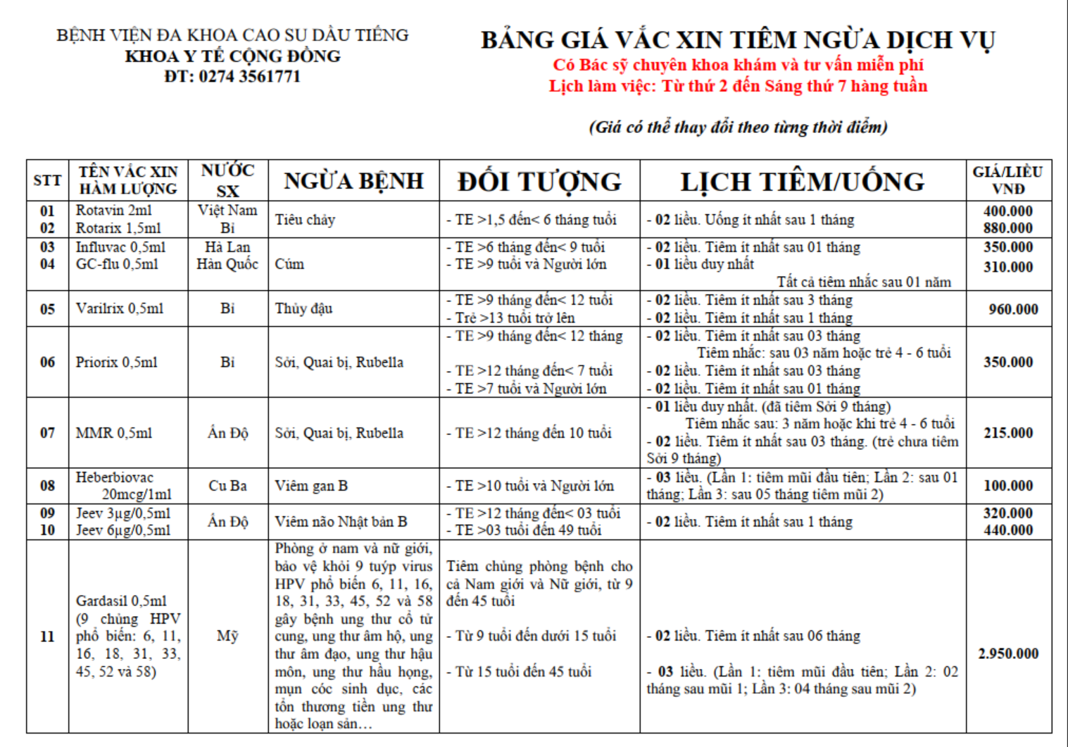 Nhằm nâng cao chất lượng chăm sóc sức khỏe cộng đồng, Bệnh viện Đa Khoa Cao Su Dầu Tiếng xin trân trọng thông báo: bảng giá mới cho các loại vắc xin hiện đã được cập nhật. Chúng tôi luôn nỗ lực cung cấp đầy đủ các loại vắc xin phù hợp với từng độ tuổi và nhu cầu phòng bệnh của người dân.